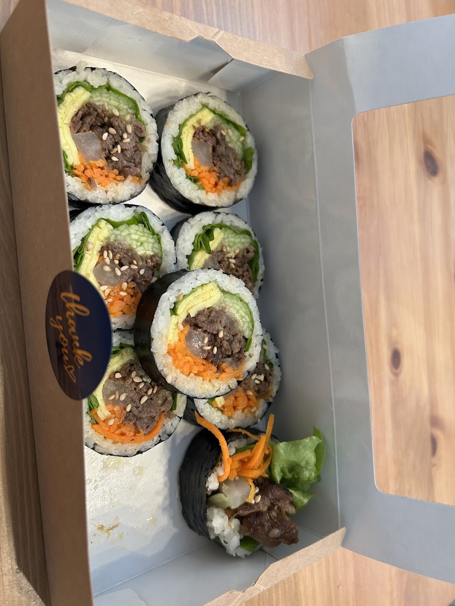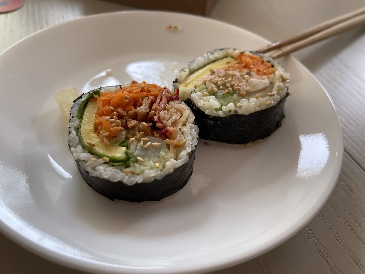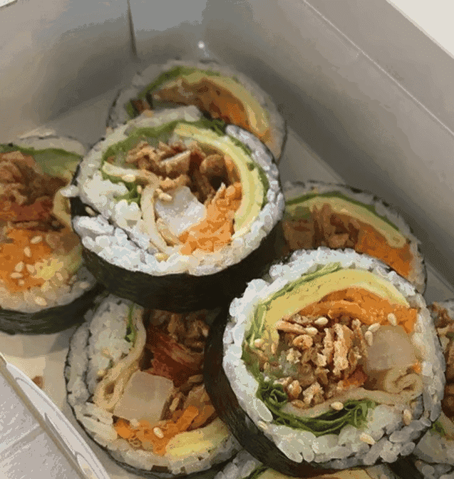 Rice, tuna mayonnaise, egg, carrot, cucumber, kimchi, perilla leaf.