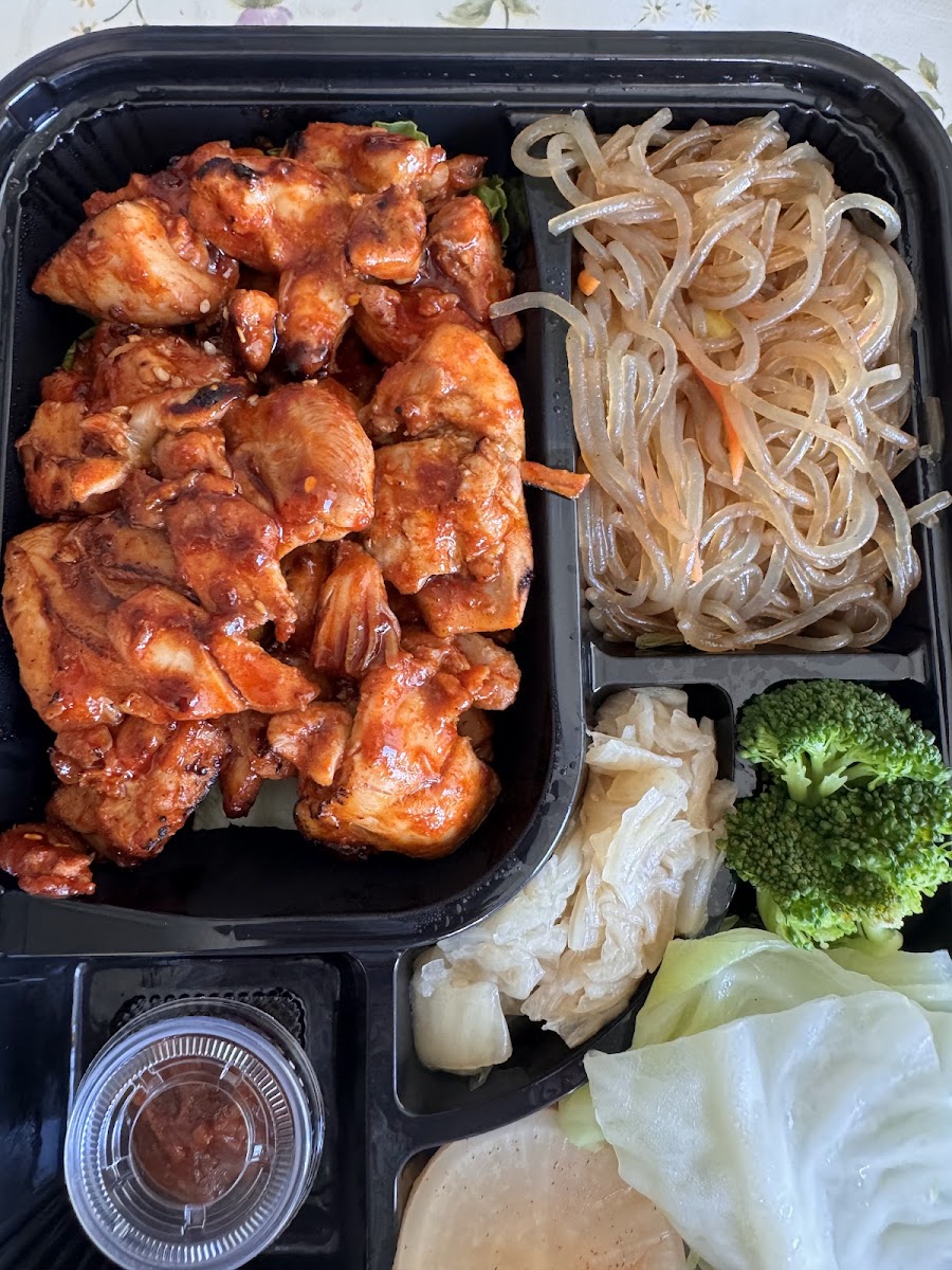 Medium-hot. Rice, spicy chicken, egg, carrot, cucumber, radish, perilla leaf.